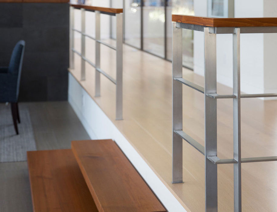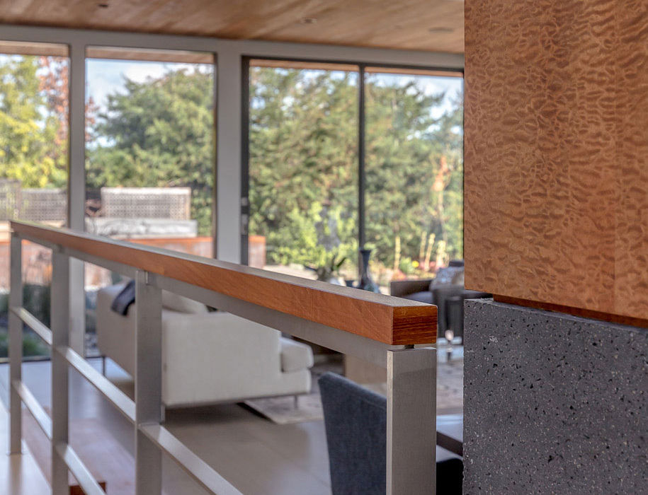 The game room also features a stone wall where a rock picked up while hiking by one of the owners, was matched and included in the construction. The old house had a large existing fireplace in the middle of the living and dining rooms that was kept but was seriously updated with new gas insert, wood and stone cladding. The old house also had many Fleetwood windows and sliding doors, which were refinished and kept, with new matching units used as clerestories to increase the roof height.