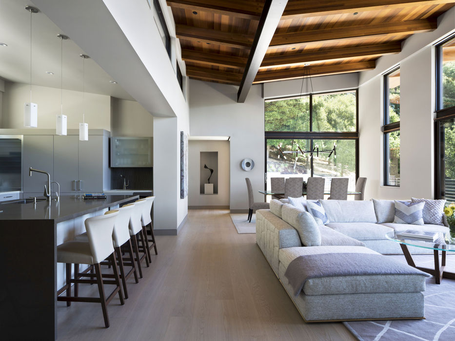 We were also asked that we explore roof forms such as butterfly shapes that arched upward to take in the views of the valley beyond, and it became clear that the steep rising hillside made placing most of the living space on the second floor the best solution. The ground floor has the main entry stairs, three-car garage and woodworking shop with walkable skylights in the roof ceiling. This space can also be a fourth bedroom for resale in the future. Going up to the second floor, there is an elevator as well as the main living spaces and bedrooms, pool and guest bedroom. Spectacular views of the valley are seen from every room and on the wrap around decks outside. Working with the landscape architect the hard- and soft-scape compliments the home with spots of floral color and easily walkable paving.