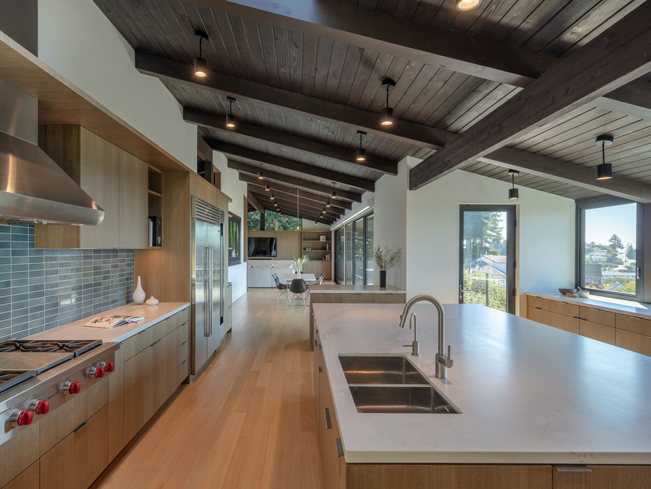 The living room received attention with new high clerestory windows above a built-in fireplace, bookcase and entertainment cabinet in wood matching the kitchen. New Fleetwood sliding doors on either side give a see through experience from the street to the view side of the house. An existing stair opening was kept, but reversing the stair direction with a new open steel and wood staircase improved circulation dramatically.