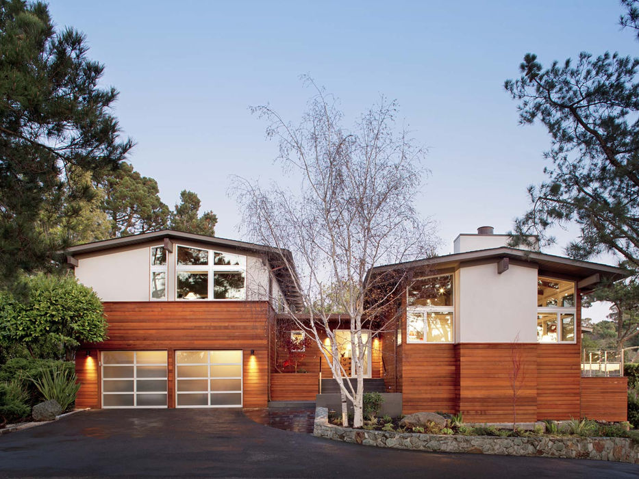 Sitting on top of a hill in Tiburon with great views of the S.F. Bay this 3,500 square foot home was re-skinned with new heavy-duty aluminum windows and doors, roof, natural cedar siding and stucco exterior walls. An existing wood deck on columns was re-designed into a more solid cedar clad box enclosure with custom glass and stainless steel railings, and it was expanded in size to the limit allowed by the setback rules to wrap around the entire house linking the living room to the backyard.